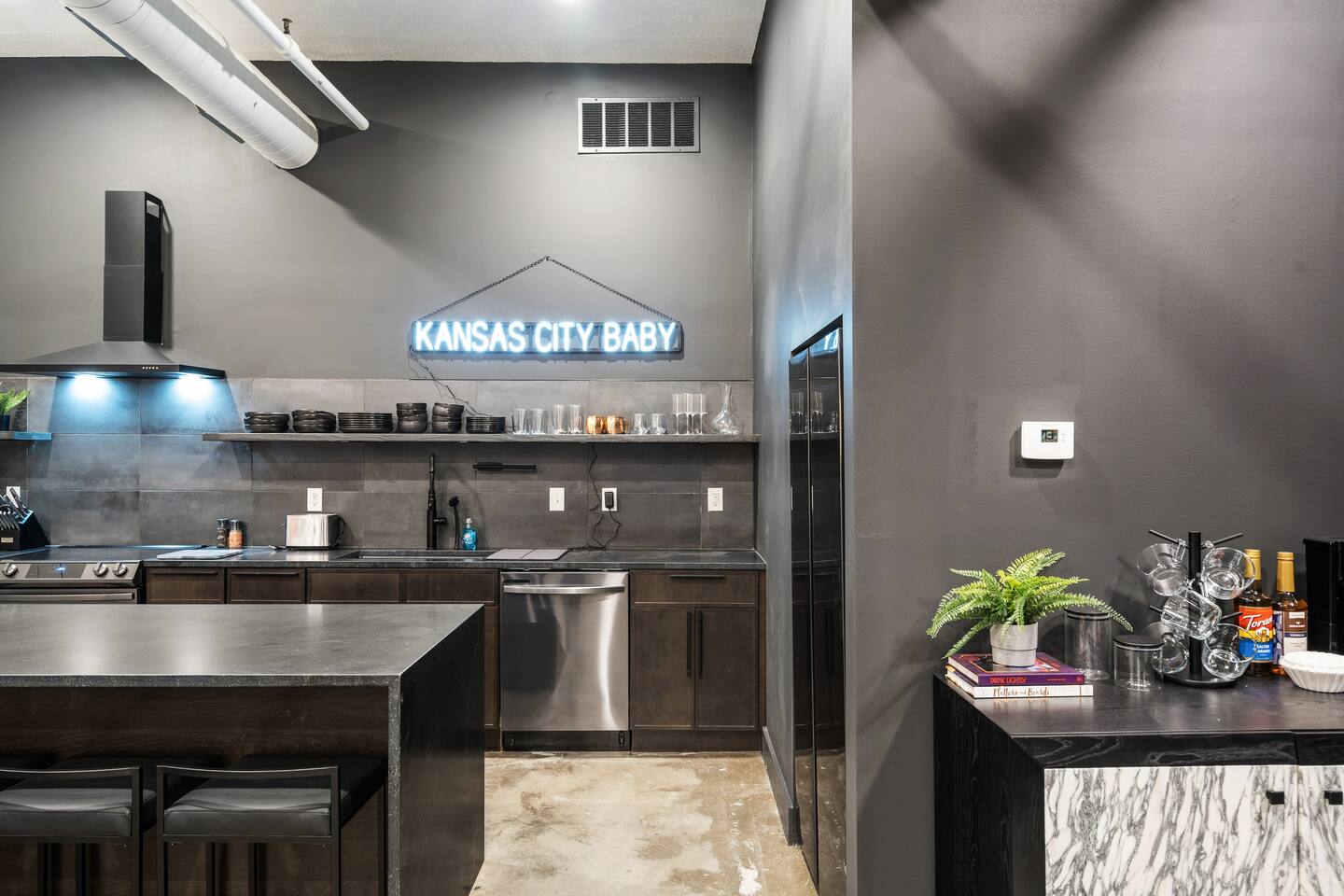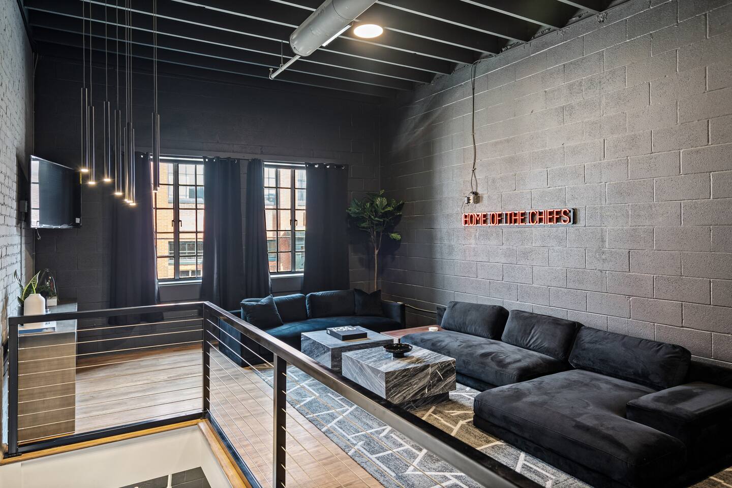 This modern 5-bed, 2.5 bathroom loft is the perfect spot to feel right at home. Whether you’re looking to host your family, your friends, or all the above, this two-floor unit has everything you need to accommodate a large group. Carefully curated and designed to offer you an exceptional city-living experience, combining modern elegance with urban sophistication. Hitting the city? You’ll be right in the heart of Kansas City. This luxury rental resides in the eclectic and vibrant neighborhood of the Crossroads Art District, known for its art, thriving food/bar scene, and walkability. This loft is set in prime location, with city vibes, a fully stocked kitchen, room for entertaining, and plenty of space to relax.This first-class loft has everything you need for a comfortable and memorable stay. Book now and experience this unique urban sanctuary in the Crossroads Arts District! The space Location: Our luxury loft is situated in a prime location, providing easy access to all that the Crossroads Arts District has to offer. Whether you're seeking fine dining, cultural experiences, or vibrant nightlife, all are just steps away from your doorstep (and from the Kansas City Streetcar)! Contemporary Design: Step into a world of contemporary design and chic aesthetics. The loft is thoughtfully decorated with high-end furnishings, premium materials, and artistic touches, creating an ambiance that exudes both comfort and style. Open Floor Plan: The loft boasts an open floor plan, optimizing the sense of space and allowing seamless flow between different living areas. The layout is perfect for both entertaining guests and unwinding in the privacy of your urban oasis. Luxury Amenities: Indulge in the finest amenities that this luxury loft has to offer. From state-of-the-art kitchen appliances to high-tech entertainment systems, every detail is designed to elevate your living experience. Natural Light: Large windows and skylights provide natural light while offering city views both day and night. Tech-Enabled, Secure Living: Your safety is paramount. Rest assured, the loft is equipped with top-notch security measures to offer you peace of mind during your stay. Immerse in the City: With this luxury loft as your base, immerse yourself in the city's energy and culture. Explore local coffee shops, restaurants, bars, and art studios to embrace the unique charm of the Crossroads Arts District neighborhood. Additional features: -High-speed Wi-Fi -Central Heat & Air Conditioning -5 Smart TVs across both living spaces and in 3 bedrooms all with installed apps to login to your favorite streaming account. (1x75 in, 3 x60 inch, 1x 55 inch) -Fully equipped and stocked kitchen -Street Parking (on an off-street, away from the main streets) -4 bedroom / 2.5 bath 3200 sq ft home -2 King beds, 3 queen beds, 2 queen blow up mattresses -Washer + dryer laundry on the 1st floor -All beds have memory foam mattresses -Games and Pop-a-Shot! -Iron, ironing board, and blow dryer in unit. Whether you're visiting the city for a family reunion, a staycation, and/or a bachelor(ette) party, our luxury loft promises an unforgettable stay. Other things to note Please treat the space with respect. If any problems arise, we will do our best to take action ASAP, but there is no one living on site 24/7. 14 guests max ***Note: No Smoking inside and outside of the property. $500 Penalty Fee for Smoking at the property, plus any cleaning/treatment needed to get rid of the smell. ***Note: No Pets allowed inside of the property. $500 Penalty Fee plus all costs to clean/restore the accommodations if an unauthorized pet is found in the property. ***Note: There are 3 cameras on the property. 1 oversees the driveway (Ring floodlight), Ring Doorbell Camera and 1 camera on the fire pit side yard. The home is also monitored for noise decibel levels. ***Note: This property has Minut sensors installed inside the property that checks and notify us regarding noise levels especially starting by 10pm. Please be respectful of this. ***Note: Do not pull the Fire Alarm if not necessary otherwise, guest will be responsible for the cost of Fire Dept. visit